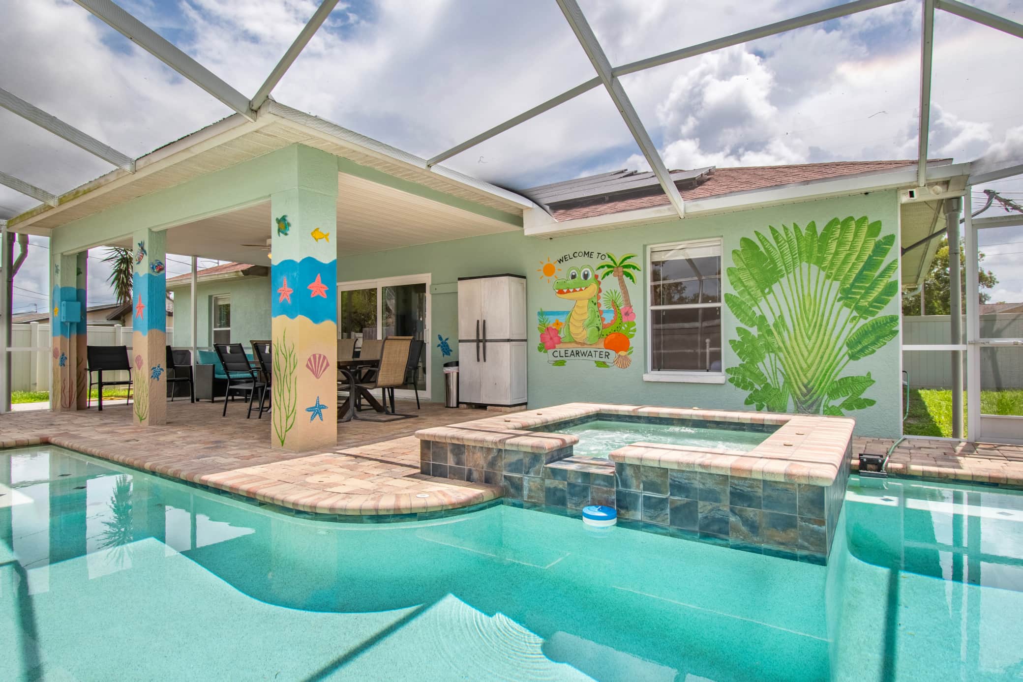 Welcome to your Exquisite Florida Oasis 3/2 Home Retreat. Enjoy privacy w a fenced yard, a sun &mosquito-protected pool dome, a luxury saltwater pool w a jetted spa jacuzzi (heatable for $35/day). Located near famous attractions: